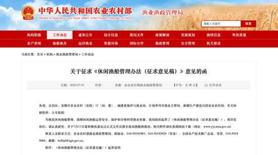 为规范休闲渔船管理,保障休闲渔船运营安全,保护和合理利用渔业资源,农业农村部渔业渔政管理局组织起草了《休闲渔船管理办法(征求意见稿)》,并发函征求各单位意见。