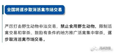 陈谞强调,将严厉打击野生动物非法交易,禁止食用野生动物,限制活禽交易和宰杀,鼓励有条件的地方推广活禽集中宰杀,逐步取消活禽市场交易。