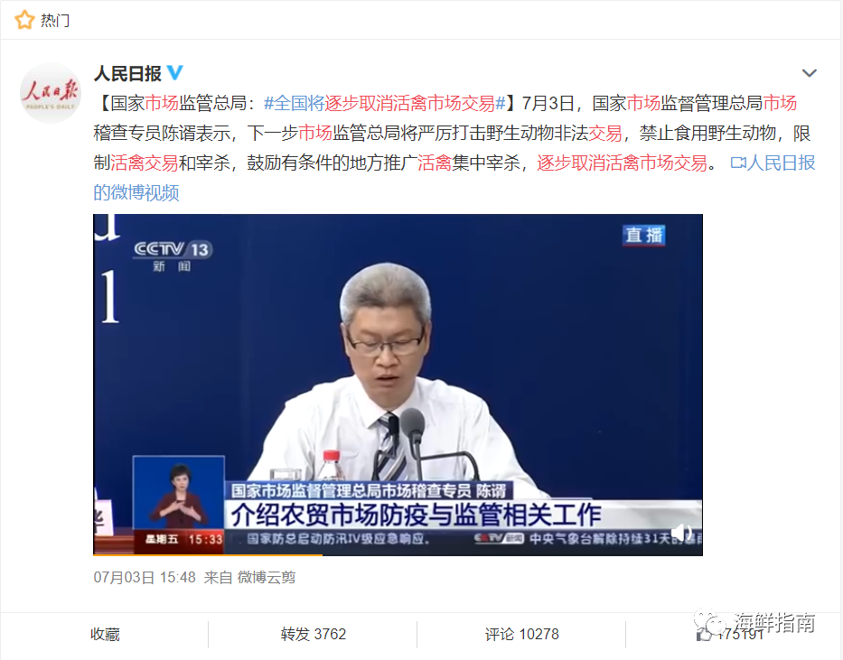7月3日下午,国务院联防联控机制在北京召开新闻发布会。会上,国家市场监督管理总局市场稽查专员陈谞介绍,农贸市场包括批发市场,是城市食品供应的重要渠道,据了解70%以上的畜禽肉、水产品、蔬菜水果,均通过农贸市场批发市场流入我们市场流通的。