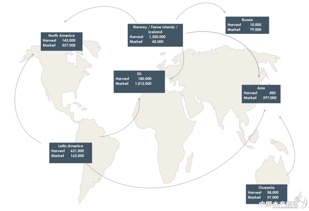 这几个产区供应的市场有些区别,挪威产区主要供应欧盟、俄罗斯(尤其是2014年俄罗斯禁止以前)和亚洲;智利三文鱼主要供应美国、南美和亚洲;加拿大主要供应美国;苏格兰三文鱼主要在自己本土市场消耗(编者注,也有少量出口到欧盟市场)。