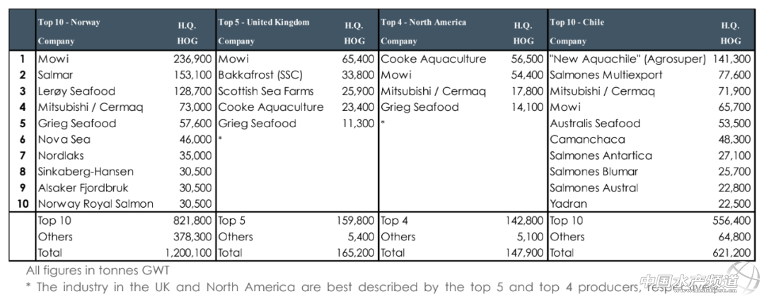以下是挪威、智利、苏格兰、加拿大主要三文鱼生产商名单及2019年产量详情: