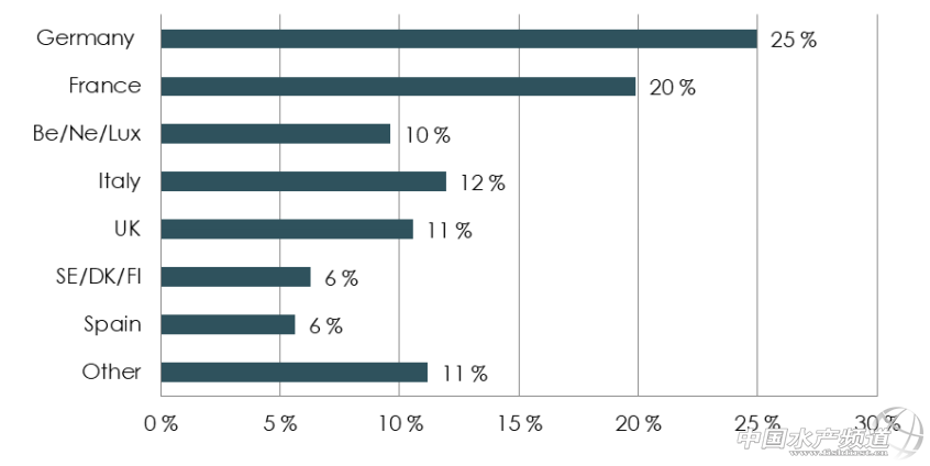 除冰鲜以外的最大加工产品——烟熏三文鱼,烟熏三文鱼最常见于欧洲,欧洲烟熏三文鱼(以大西洋鲑为原料)的市场在2019年达到256,500吨,其中德国和法国为最大市场。假设烟熏三文鱼从原料到成本的出成率是50%,这就意味着欧洲在2019年消费了128,250吨烟熏三文鱼产品。
