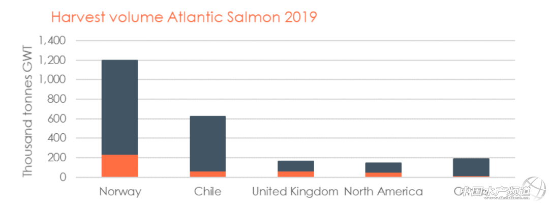 2019年,全球三文鱼产量增长了6%,其中,挪威增长了6%,智利增长了8%,英国(苏格兰)增长了2%,北美(加拿大)增长了2%,其他地区(包括法罗群岛、爱尔兰、澳大利亚塔斯马尼亚、冰岛和俄罗斯)增长了7%。
