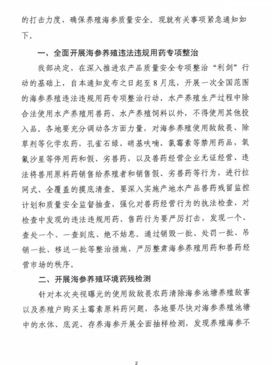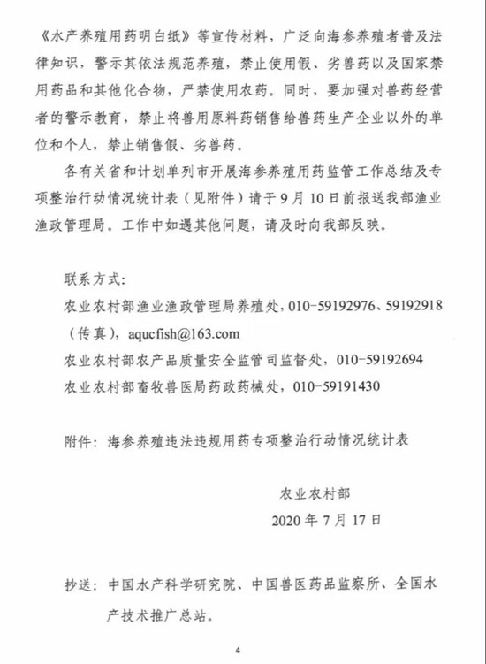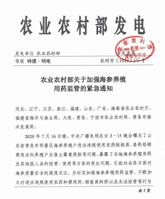 为切实加强海参养殖用药监管,不断加大对违法违规使用农药和禁用药、销售原料药以及无证经营等行为的打击力度,农业农村部7月17日下发《关于加强海参养殖用药监管的紧急通知》,组织各地开展海参养殖违法违规用药专项整治行动。