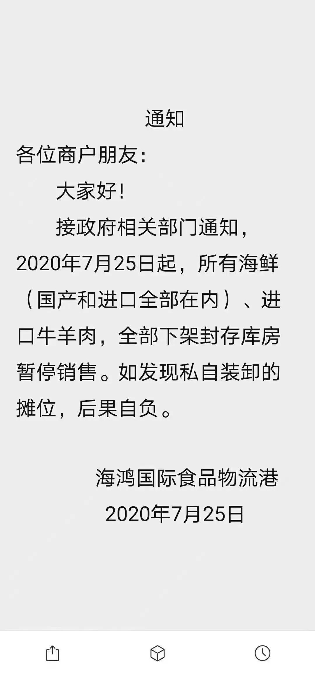 乌鲁木齐海鸿肉类水产冻品市场休市,所有海鲜(无论是进口还是国产),进口牛羊肉全部封库暂停销售。