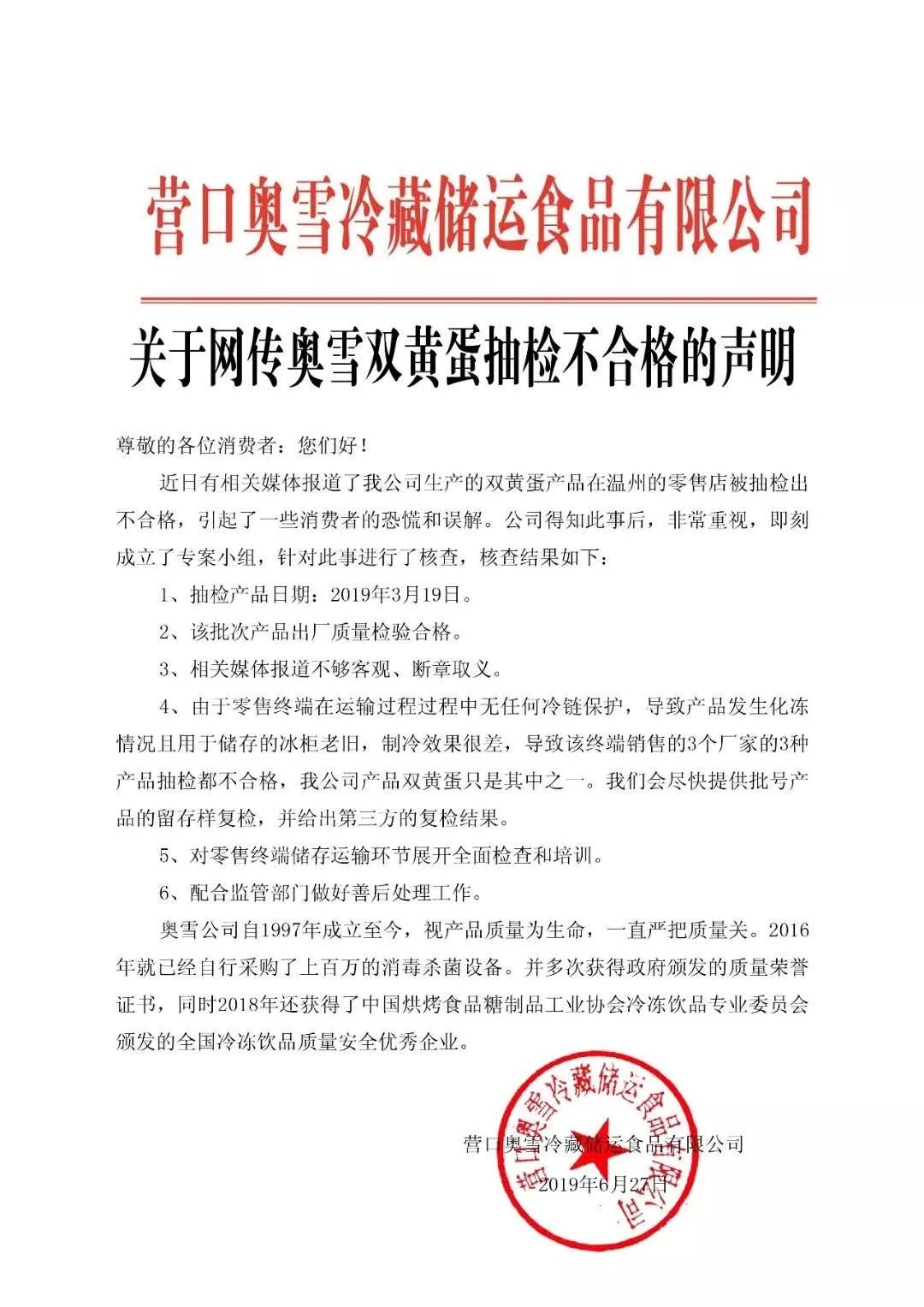 奥雪冷藏储运食品有限公司关于网传奥雪双黄蛋抽检不合格的声明[24]