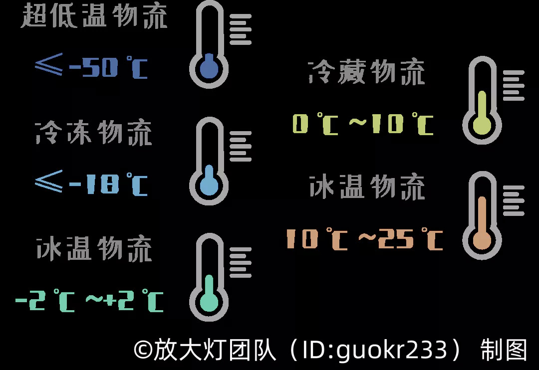 和你家冰箱分冷冻室冷藏室类似,冷链也有不同的温度。《GB/T 28577 冷链物流分类与基本要求》[4]按不同温度区段将冷链物流分为了超低温物流、冷冻物流、冷藏物流等。