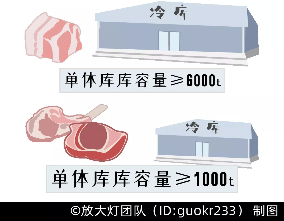 这些储备肉会分散在符合条件的承储企业冷库中,商务部曾在2018年7月和2019年1月按《中央储备肉冻肉储存冷库资质条件》分别建立了中央储备冻猪、牛羊肉承储企业的备选名录库。《资质条件》对承储冷库提出了规模要求: