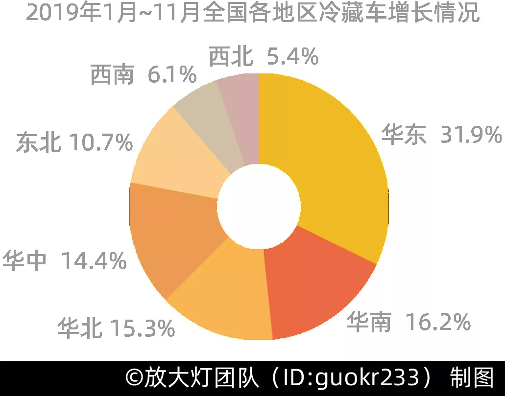 和冷库的地域分布类似,冷藏车的区域增长也呈现出东多西少的特点,其中华东地区增长量最高。你需要生鲜电商和便利店,而这些商家需要冷藏车。
