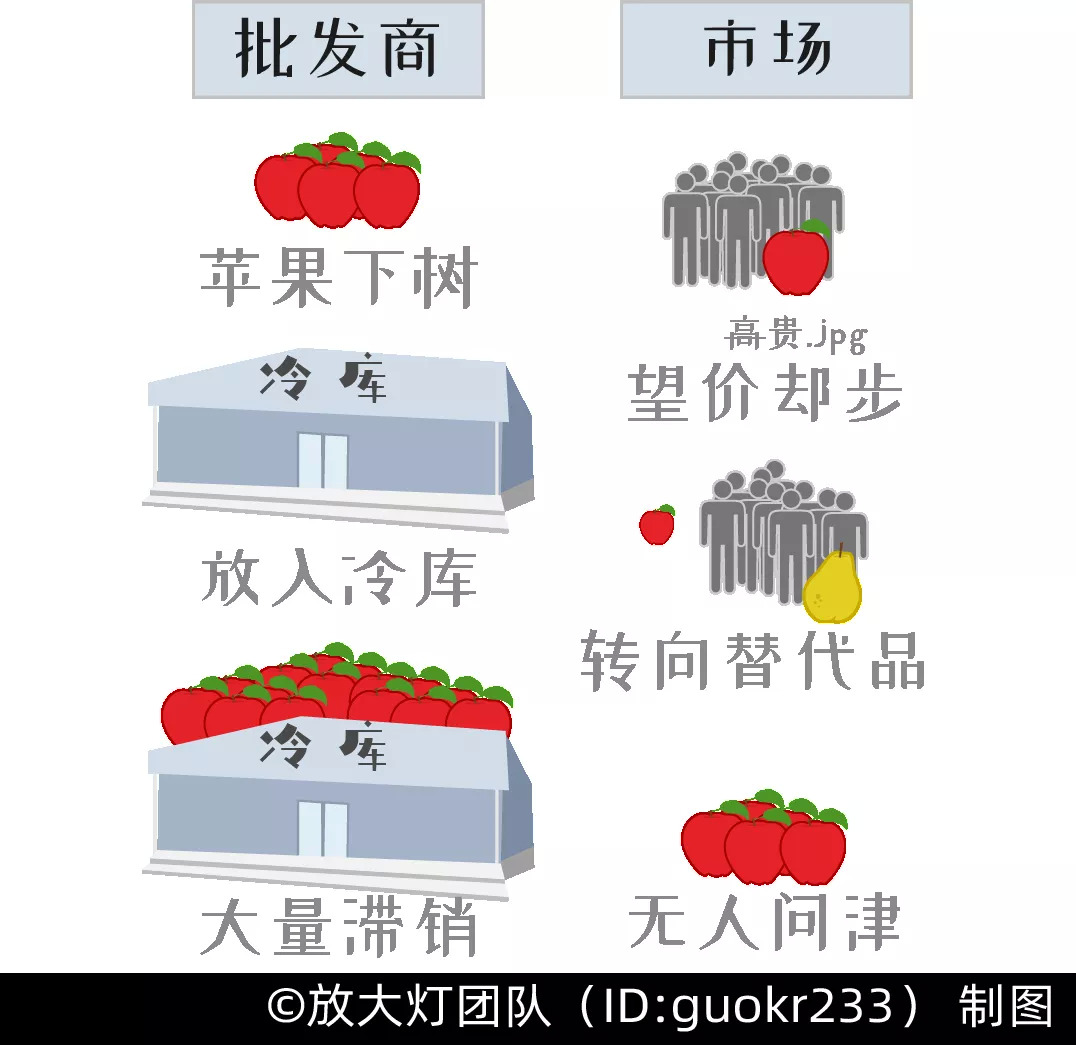 大量囤货不仅人为抹去了苹果的销售“旺季”还因为破坏供需关系造成市场的恶性循环:收获初期价格虚高→苹果入库囤货待涨→库存堆积价格下跌。