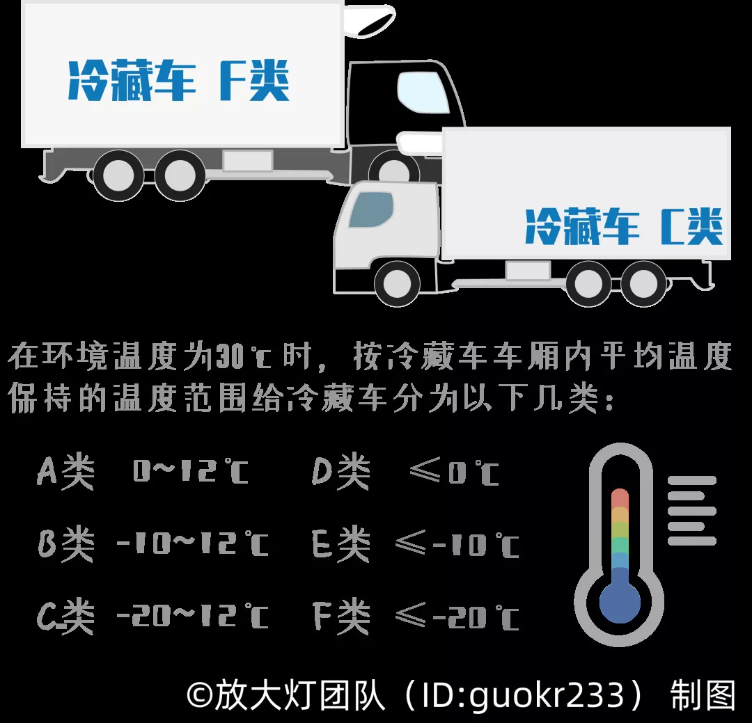 你可能也会在路上看到标有“G类”“H类”字样的冷藏车,它们并不是运输食物的,而是运生物制品的,比如疫苗、血液制品等[28]。