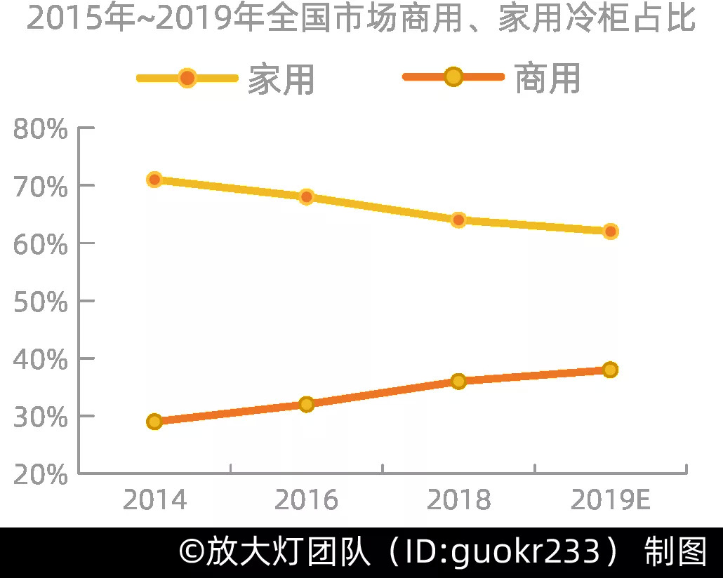 2015年~2019年全国市场商用、家用冷柜占比 | 资料来源:国元证券研究中心[30]