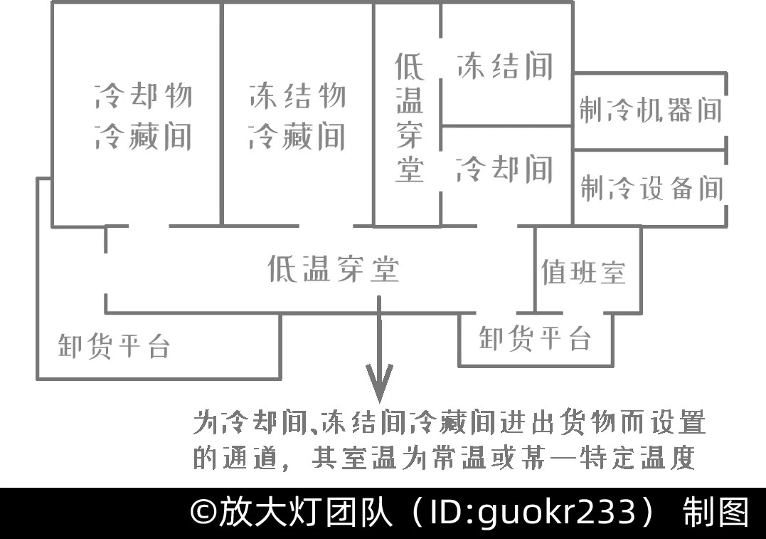 相比家用冰箱,冷库中增加了冷加工食物的房间——冷却间和冻结间,货物需要按照固定顺序完成降温后才能贮藏。相应地,储藏这两种冷加工食品的房间就是对应的两种冷藏间,这就像是“大冰箱”了。