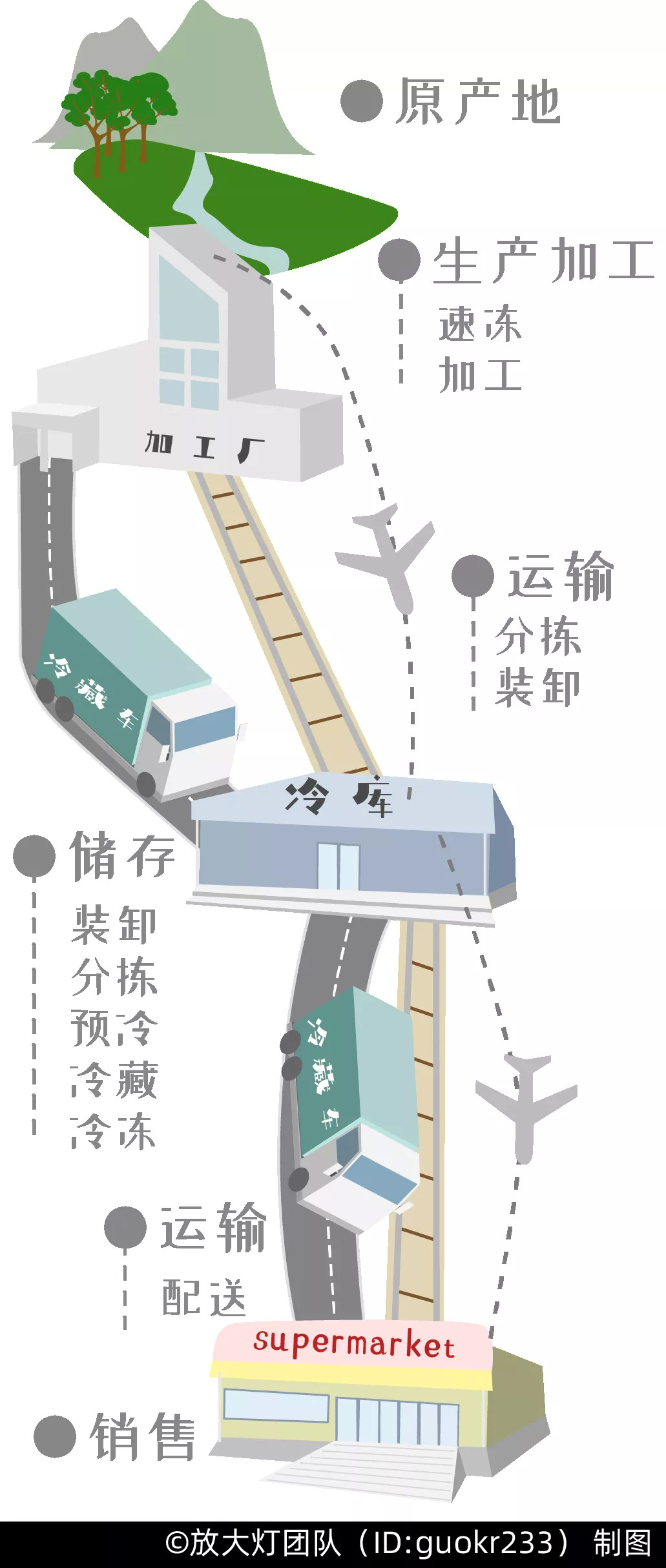 冷冻肉、冰淇淋、冰鲜水产、酸奶、冷冻果蔬等食物就是典型的冷链物品。在被消费者带回家之前,它们需要经历这些: