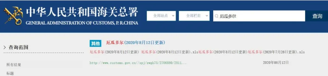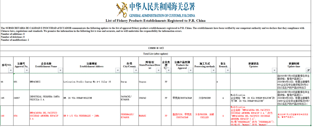这是第二家厄瓜多尔企业得到解禁。这两个品牌为:桑塔Santa Priscila(注册编号24887)和蓝泰Empacreci(注册编号681)两家出口资格已经恢复。