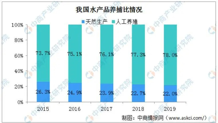 我国渔业生产实行“以养殖为主,养殖、捕捞、加工并举,因地制宜,各有侧重”的方针。2018年,我国天然生产水产品产量1466.6万吨,占比77.3%。人工养殖水产品产量为4991.1万吨,占比77.3%。农业农村部副部长于康震在渔业改革创新高质量发展推进会上表示,2019年我国水产品养殖约5050万吨,同比增长1%左右。产业结构进一步优化,养捕比达到78:22。
