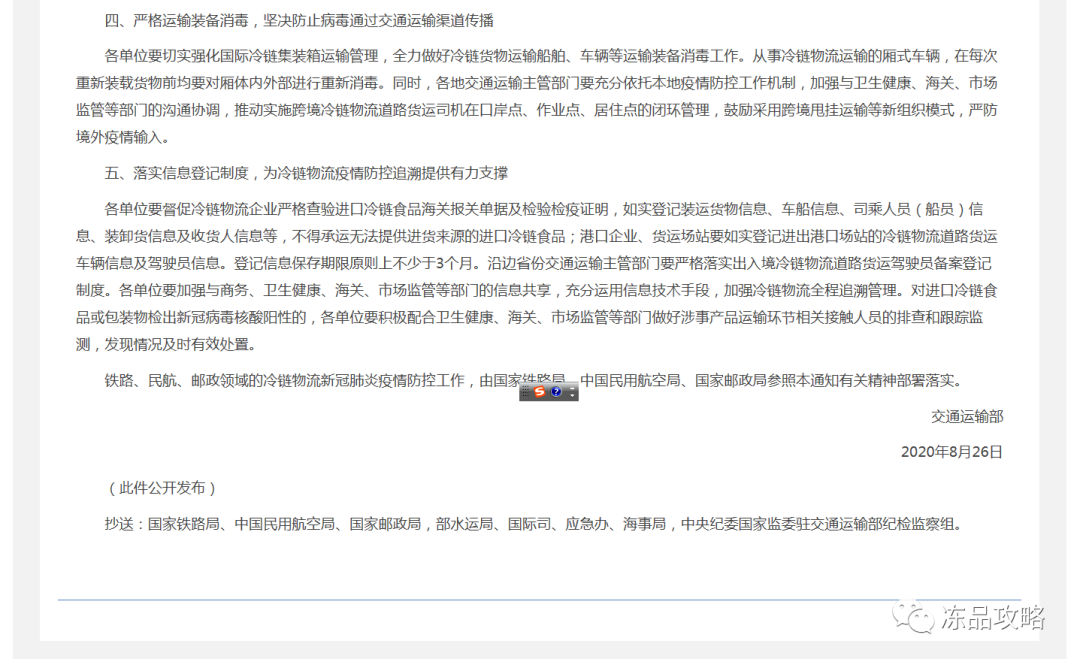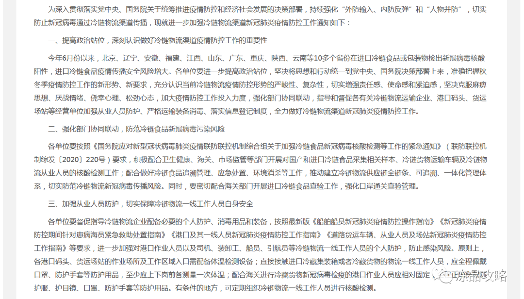 通知强调,各单位相关部门积极配合卫生健康、海关、市场监管等部门开展与国产和进口冷链食品相关的样本采集、核酸检测、通关查验、环境消杀、应急处置等各项工作,推动建立冷链物流供应链全链条、可追溯、一体化管理体系,切实防范冷链物流新冠病毒传播风险。