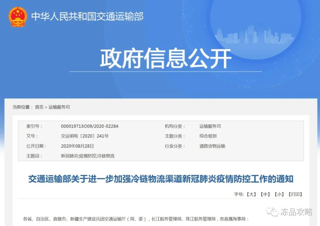 近日,交通运输部发布《进一步加强冷链物流渠道新冠肺炎疫情防控工作》的通知(以下简称:《通知》),要求交通运输管理部门持续强化“外防输入、内防反弹”和“人物并防”,全力做好冷链物流渠道新冠肺炎疫情防控工作,切实防止新冠病毒通过冷链物流渠道传播。进口水产安全再有保障!