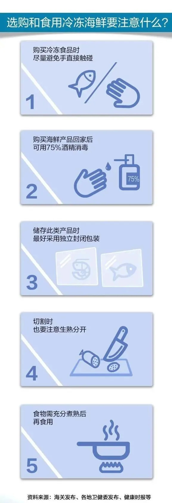 魏晟也提醒," 为避免潜在风险,公众在选购以及处理进口冷冻食品时,应该注意尽量避免手直接触碰,戴上手套。购买海鲜产品回家后,可用酒精消毒包装。同时注意生熟分开,食物充分煮熟后再食用。"
