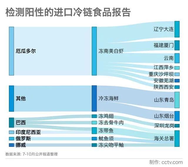 最初,出现阳性的样本多为厄瓜多尔冻南美白虾外包装。自8月开始,冻鸡翅、冻去骨牛肉、冻带鱼等逐渐出现在名单上,来源地从遥远的巴西和挪威一直延伸到与我国接壤的俄罗斯。