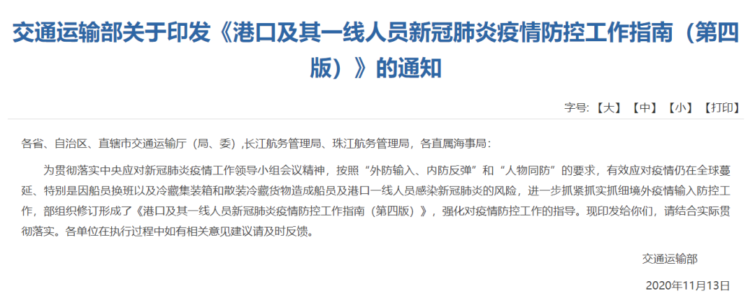 本月以来,多地出现进口冷链食品外包装新冠病毒核酸检测呈阳性的案例。近日,交通运输部印发两份工作指南,对港口和冷链食品运输的防疫工作进一步的规范。指南要求,在冷链物流过程中,不能使货物直接接触地面,司机及随行人员应当避免与门卫值班员、工作人员有不必要的接触。港口工作人员尽量避免与船员发生直接接触,进口冷藏集装箱拆箱作业当中,人员应相对固定,实行闭环管理,全程穿防护服、佩戴口罩以及防护手套、防护面罩等用品,至少每周开展一次核酸检测。
