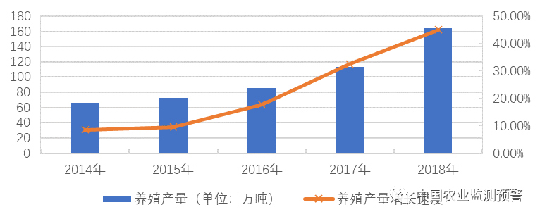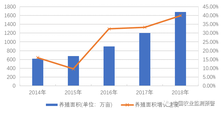 1. 养殖面积快速扩大。近年来,我国小龙虾养殖面积连续5年持续增长,2016年以来增长速度明显加快。2018年我国小龙虾养殖面积突破1680万亩,较2017年增长约40%(图1)。