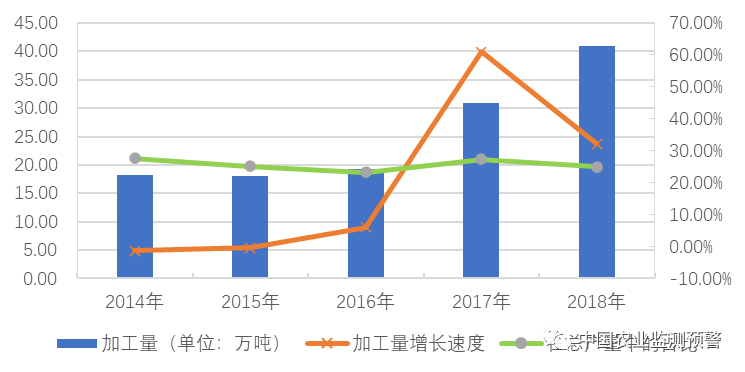 1.加工量占比稳定,加工区域明显聚焦。全国小龙虾加工总量增长明显,2018年加工量约为40.9万吨,比2017年增长32.2%。小龙虾加工企业主要集中在湖北、湖南、安徽和江苏,4省加工量合计近32万吨,占全国加工总量的78.24%。