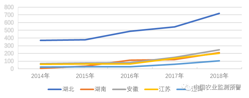 图4 2014—2018年全国五大主产省份小龙虾养殖产量变化情况(单位:万吨)