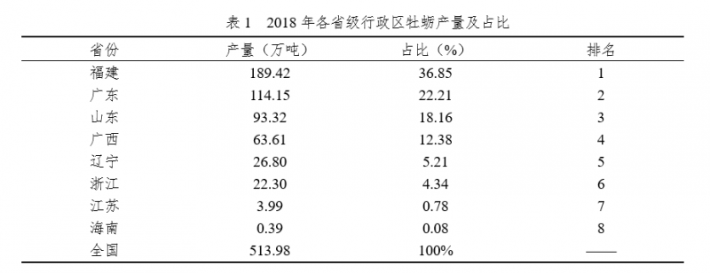 根据《中国渔业统计年鉴》提供的数据,表1按产量高低列出了2018年中国牡蛎总产量和各省级行政区牡蛎产量及其对全国牡蛎总产量的贡献。