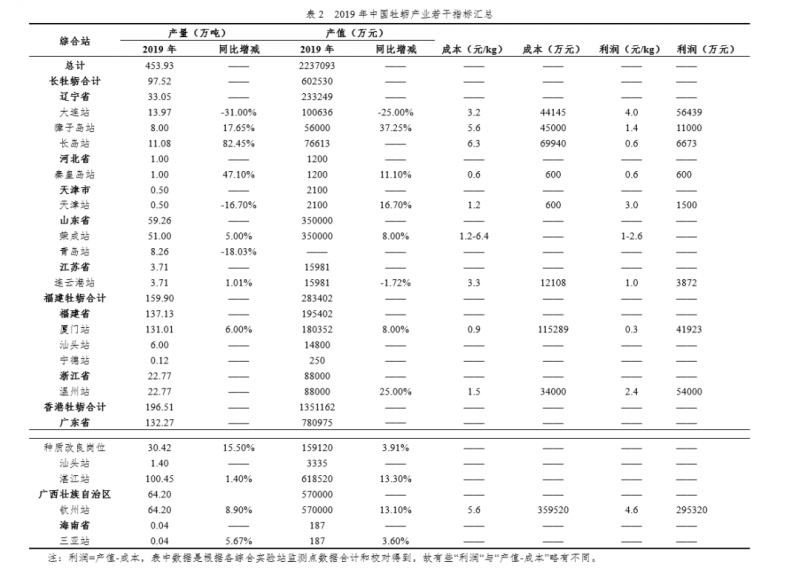据国家贝类产业技术体系不完全统计,2019年中国牡蛎产量约为453.93万吨。其中,长牡蛎、福建牡蛎和香港牡蛎的产量分别约为97.52万吨、159.90万吨(其中可能含有少量熊本牡蛎的产量)和196.51万吨(其中可能含有少量福建牡蛎的产量)。显然,除香港牡蛎产量高于2018年的178.14万吨外,其他两种牡蛎的产量均低于上年的水平。尽管如此,综观已有数据,除大连、天津和青岛综合实验站报告的数据同比下降外,其他各站提供的数字较上年均有不同程度的提高(表2)。据此,再加上实际观察到的现象,我们推测当年的实际产量应该高于2018年的513.98万吨。