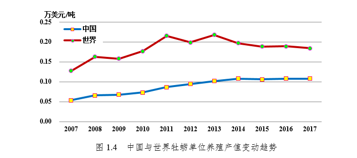 2007-2017年,中国牡蛎单位养殖产值(产值/产量)从期初的只有0.07万美元/吨增加到期末的0.11万美元/吨,实现了7.23%的年均增长率。尽管如此,中国牡蛎单位养殖产值却始终明显低于世界平均水平(图1.4)。有必要指出的是,2017年中国牡蛎单位养殖产值虽然达到了这一时期的最高水平,但与世界均值的差距(0.0768万美元/吨)却高于最低年份的2007年(0.0738万美元/吨)。