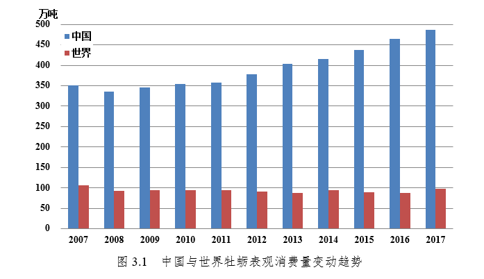 表观消费量是指当年产量加上当年净进口量(进口量-出口量)。尽管在收获后包括仓储、加工、运输在内的各个环节都有可能发生损耗,且生产量与贸易量统计也难免不出现误差,进而导致表观消费量偏离实际消费量,但由于难以获取实际消费量数据,而前者则可依据产量和贸易量计算得出,故本报告用其来近似地反映牡蛎实际消费量。图3.1给出了2007-2017年中国与世界牡蛎表观消费量的变动趋势。