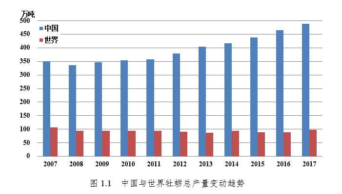 FAO统计数据显示,2007年,中国和世界牡蛎产量分别为350.89万吨和106.48万吨,两者的差距超过了2倍。此后,中国牡蛎产量逐年递增,2017年攀升至487.94万吨,与世界牡蛎产量(97.89万吨)的差距扩大到3倍以上(图1.1)。2007-2017年,中国和世界牡蛎产量年均增长率分别为3.35%和-0.84%。