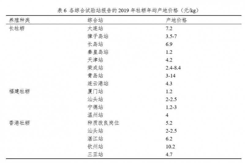 表6汇总了各综合试验站报告的2019年牡蛎年均产地价格。显然,价格最高的是钦州站报告的香港牡蛎(10.20元/kg),其次是大连站和长岛站报告的长牡蛎,分别为7.2元/kg和6.9元/kg,价格最低的则是秦皇岛站报告的长牡蛎和厦门站报告的福建牡蛎,均为1.2元/kg。
