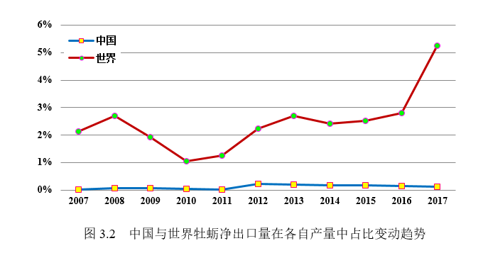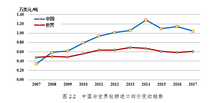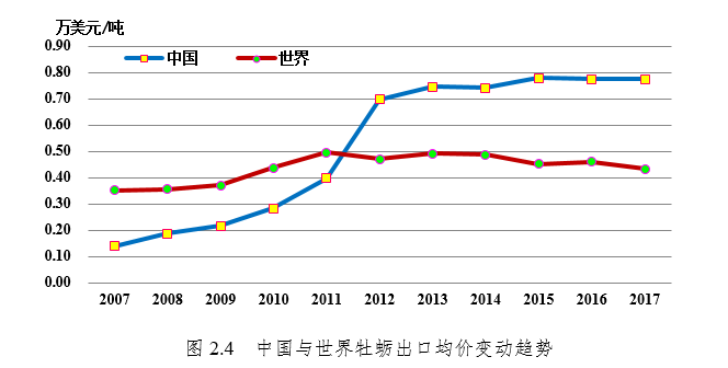 与之形成对比的是,同一时期世界牡蛎出口均价年均增长率只有2.11%。2007年,世界牡蛎出口均价(0.35万美元吨)几乎是中国的(0.12万美元/吨)3倍,随后逐年递增到2011年的0.50万美元/吨,但与中国的(0.40万美元/吨)差距缩小到只有1倍多,其后数年波动下降至2017年的0.43万美元/吨。