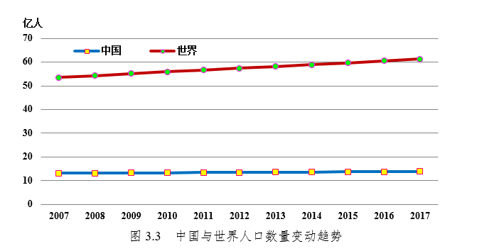 中国和世界人口分别从2007年的13.18亿和53.57亿,增加到2017年的13.86亿和61.25亿,年均增长率分别为0.51%和1.35%(图3.3)。