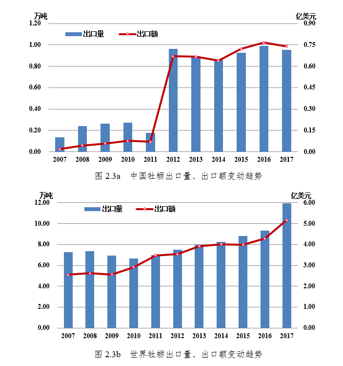 2007年。世界牡蛎出口量、出口额分别为7.25万吨和2.55亿美元,其后虽然2009~2011年的出口量低于期初水平外,其他年份的出口量和所有年份的出口额均呈上升状态(图2.3b),整个时期年均增长率达到7.32%。值得注意的是,2017年世界牡蛎出口量、出口额分别从上年的9.35万吨和4.29亿美元,跃升至11.93万吨和5.17亿美元,两者均为这一时期的最高水平。