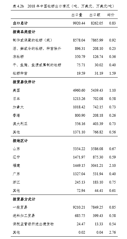 “制作或保藏的牡蛎”为主要出口商品类型,其出口量和出口额分别占当年中国牡蛎出口总量和总额的86.47%和95.21%,其次为“活、鲜或冷的牡蛎,种苗除外”、“冻牡蛎”、“干、盐腌、盐渍或熏制的牡蛎”和“牡蛎种苗”。美国、日本、加拿大、香港和澳大利亚为中国牡蛎出口的前五大目的地。最主要的贸易方式也是“一般贸易”(表4.2b)。
