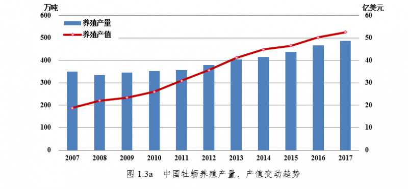 2007-2017年,中国牡蛎养殖产值始终呈稳定增长态势,从期初的18.81亿美元快速飙升至期末的52.55亿美元产值,年均增长率(10.82%)是产量的(3.35%)3倍以上(附件1)。