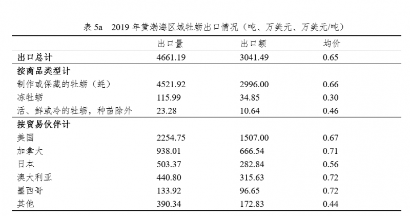 值得注意的是,本文利用海关数据和按海区划分的方法计算得出,福建出口的牡蛎均价高于黄渤海区出口的长牡蛎,这与实际观察到的情况刚好相反。一般情况下,国内市场的长牡蛎批发和零售价格都高于福建牡蛎,这一现象有待在后续研究过程中进一步理清其原因。