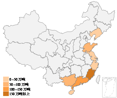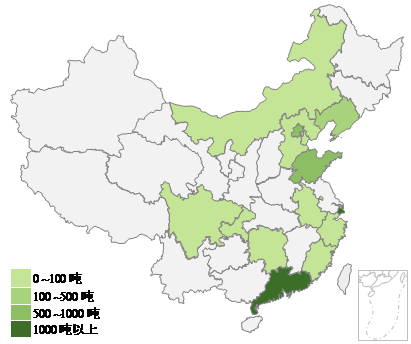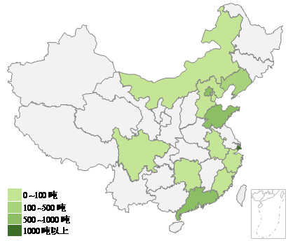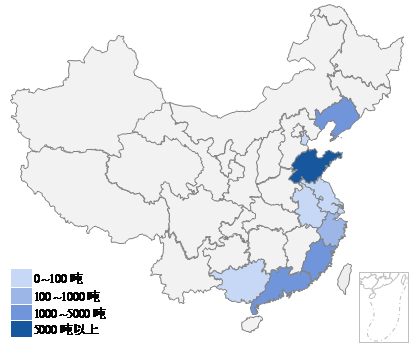 表4.2b和图4.3显示,出口量最大的地区依次是山东、辽宁、福建、广东和浙江。其中,只有山东的出口量超过了5000吨。