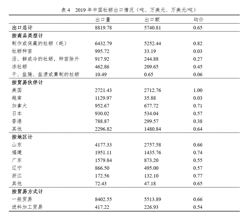 有必要说明的是,中国牡蛎种苗出口全部经由福建销往越南。2019年,福建对越南出口牡蛎种苗量异常增加,从上年的19.59吨飙升至995.72吨,增幅高达4982.54%,而出口均价却从1.59万美元/吨跌落至只有0.03万美元/吨(-97.91%),进而导致出口额仅从31.19万美元增至33.19万美元(6.40%)。这一异常现象对中国牡蛎出口量和出口均价都产生了显著的影响。若剔除种苗出口,2019年中国牡蛎出口量、出口额和出口均价依次为7824.06吨、5707.62万美元和0.73万美元/吨,较2018年分别下降20.98%、30.66%和12.25%。