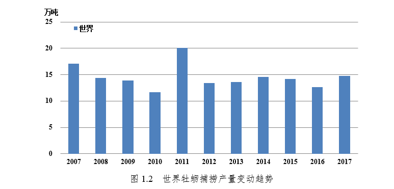 中国没有(也可能是没有单独)统计牡蛎捕捞产量,仅向FAO报告了牡蛎养殖产量。2007-2017年,世界牡蛎捕捞产量呈波动态势,产量最高和最低的年份分别是2011年(20.10万吨)和2010年(11.65万吨),期末产量(14.78万吨)比期初的17.12万吨减少了2.34年万吨(图1.2),年均增长率也为负值(-1.46%)。