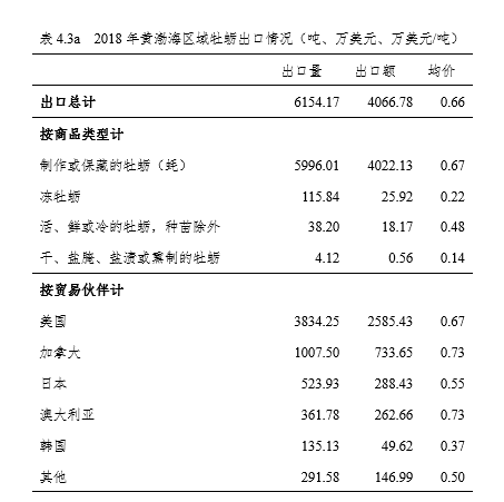 黄渤海、东海和南海三大海区,分别是中国三大主要牡蛎养殖品种长牡蛎、福建牡蛎和香港牡蛎的主产区。其中,黄渤海区域包含江苏以北各沿海省市,东海区包含上海、浙江和福建三省市,南海区域包含广东、广西和海南三地。为分析2018年中国三大主养牡蛎品种的出口情况,我们将各省级行政区以“一般贸易”方式出口的牡蛎数量和金额,分别按对应的海区汇总统计,结果如表4.3a~c。
