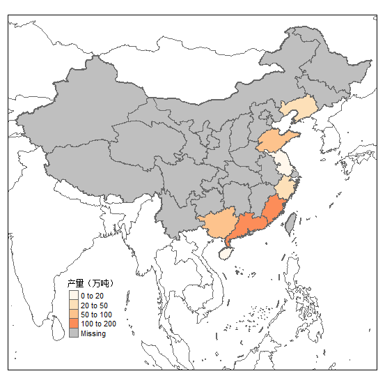 图4.1显示了2018年中国牡蛎产量的空间分布情况。其中,福建和广东的产量分别超过了150万吨和100万吨,山东和广西的产量均超过了50万吨,而辽宁和浙江的产量也超过了2017年位居世界第三的美国(20.72吨)和第四的日本(17.38万吨)的水平(见前文)。