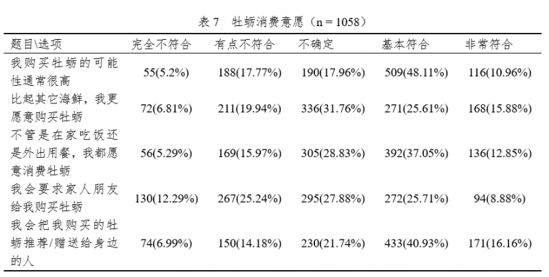 2019年,我们开展了中国居民牡蛎消费意愿市场调查。结果显示:95.84%的受访者都认识牡蛎,77.32%的受访者在最近一年内购买过牡蛎;关于能否识别出市场上牡蛎种类的问题,受访者的选择集中在不太清楚(31.38%)、不确定(28.07%)和比较了解(34.03%);关于“如何判断牡蛎的品质”,选择“完全不知道”、“不太清楚”和“不确定”的受访者占比高达80.9%(表7)。这表明,中国居民虽然大都认识和有过牡蛎消费经历,且有着较为强烈的消费意愿,但认知程度尚处于初步了解阶段,这表明牡蛎市场还有进一步开拓的空间。