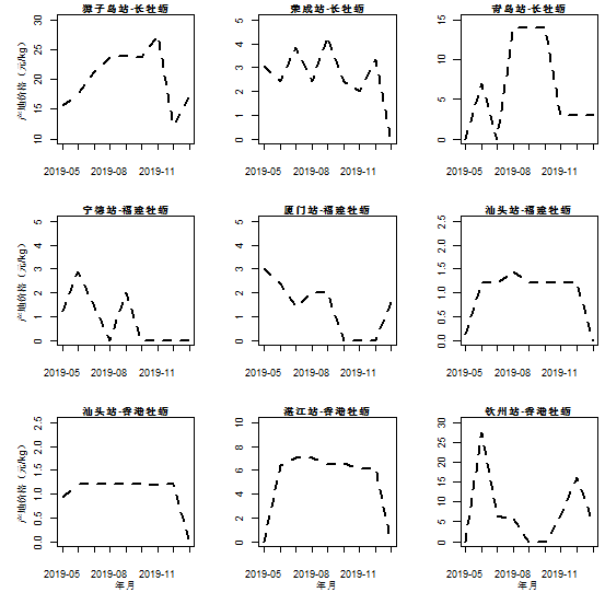 图7是根据养殖渔情系统中的数据绘制而成的2019年5月至2020年1月牡蛎产地价格变动轨迹(图中为0的地方,表示系统中没有上报的价格数据)。显然,各站报告的牡蛎产地价格都表现出明显的季节性波动。就长牡蛎而言,獐子岛报告的价格峰值(27.3元/kg)较荣成(4.32元/kg)和青岛(14元/kg)滞后一个月左右。除汕头站外,宁德和厦门站报告的福建牡蛎前期价格均高于后期。具体到香港牡蛎,钦州站报告的价格变动轨迹明显不同于汕头站和湛江站的情形。