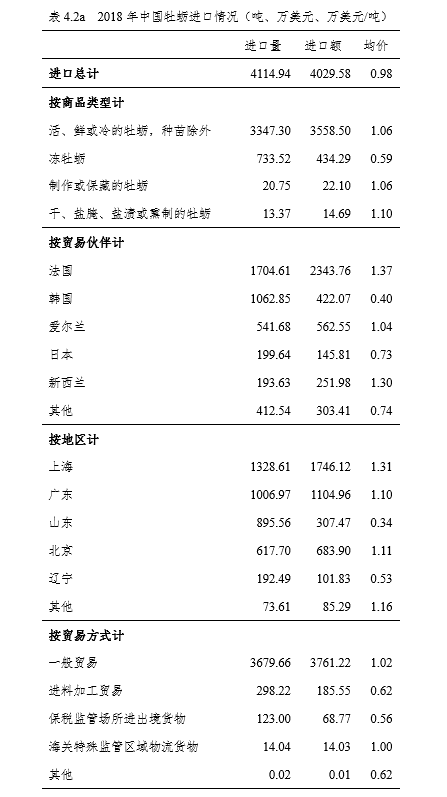 “活、鲜或冷的牡蛎,种苗除外”为主要进口商品类型,其进口量和进口额分别占当年中国牡蛎进口总量和总额的81.35%和88.31%,其后依次为“冻牡蛎”、“制作或保藏的牡蛎”和“干、盐腌、盐渍或熏制的牡蛎”。法国、韩国、爱尔兰、日本和新西兰为中国牡蛎进口的前五大来源地。最主要的贸易方式是“一般贸易”(表4.2a)。