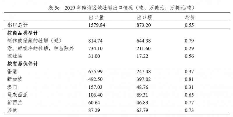 2019年,三大海区中牡蛎出口额和出口均价同比增长的只有南海区域,当年的出口量、出口额和出口均价依次为1579.84吨、873.20万美元和0.55万美元/吨,同比分别增长19.04%、64.13%和37.88%。南海区主要向港澳地区出口活、鲜或冷藏的牡蛎以及向新加坡和马来西亚出口制作和保藏的牡蛎。显然,南海区主要的出口商品类型和出口目的地都与其前两个海区有所不同。
