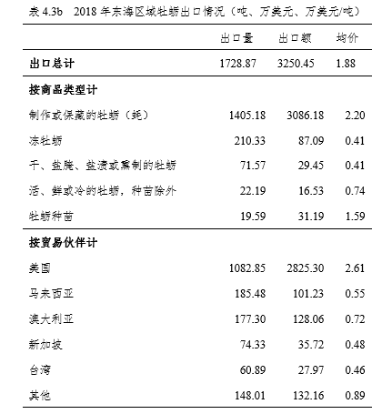 2018年,黄渤海区域牡蛎出口量居三大海区之首(6154.17万吨),其后依次为东海区域(1728.87吨)和南海区域(1327.18吨)。其中,黄渤海和东海区域都以出口牡蛎的制作和保藏品为主,且最主要的目的地都是美国。虽然黄渤海区出口量是东海区的3.56倍,但由于后者的出口均价高达1.88万美元/吨,是前者(0.66万美元/吨)的2.84倍,因此黄渤海区出口额(4066.78万美元)仅比东海区域(3250.45万美元)高25.11%。